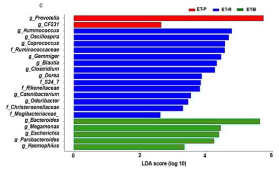In LEfSe analysis, the primary bacteria in each dietary pattern were identified in genus level by the LDA >2.0 (p < 0.05), and unidentified bacteria in genus level were indicated as a family name (Figure 3C). ET-P mainly included Prevotella. ER-R highly contained Ruminococcus, Oscillospira, Gemmiger, and Ruminococcaceae, which belonged to Ruminococcaceae, and ET-R also included Blautia and Coprococcus, a family of Lachnospiraceae (Figure 3C). ET-R was mainly composed of Ruminococcaceae and Lachnospiraceae. ET-B included Bacteroides, Parabacteroides, and proteobacteria (Escherichia, and Haemophilus) (p < 0.05; Figure 3C).