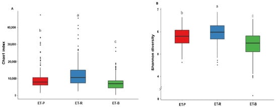 Alpha diversity in different enterotypes. (A) Chao1 index. (B) Shannon diversity. Different alphabets (a,b,c) represented significant differences among the different bacteria in the family level by Tukey’s test at p < 0.05. ET-P, Prevotellaceae; ET-R, Ruminococcaceae; ET-B, Bacteroidaceae.