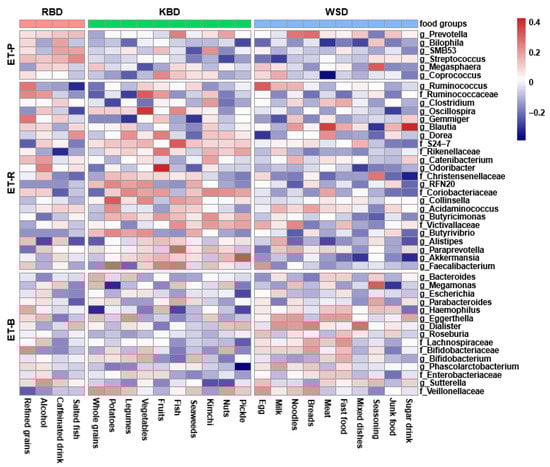 Heatmaps of partial Spearman correlations between intakes of food groups in each dietary pattern and relative abundance of gut microbiota at the genus level. Food groups were gathered into each dietary pattern, and fecal bacteria were arranged into one enterotype when the bacteria contents were higher than the other enterotypes, and they were classified into ET-P, Prevotellaceae; ET-R, Ruminococcaceae; ET-B, Bacteroidaceae.