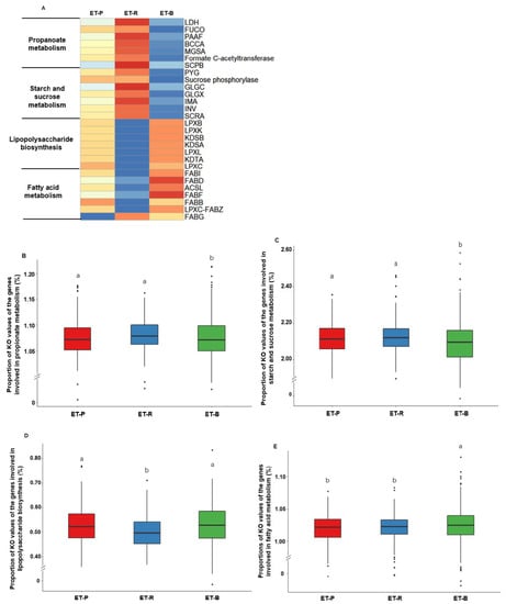 Heatmaps of abundant genes involved in metabolic functions determined by (A) PICRUSt2 and (B–E) the relative abundance of the genes related to significant metabolic functions in three enterotypes. (A) The association of the genes related to different functions in three enterotypes. (B) Propionate metabolism in three enterotypes. (C) Starch and sucrose metabolism in three enterotypes. (D) Lipopolysaccharide biosynthesis in three enterotypes. (E) Fatty acid metabolism in three enterotypes. LDH, L-lactate dehydrogenase; Figure 1. phosphate adenylyltransferase; GLGX, glycogen debranching enzyme; IMA, oligo-1,6-glucosidase; INV, beta-fructofuranosidase; SCRA, sucrose phosphoenolpyruvate-dependent sucrose phosphotransferase system permease component; LPXB, lipid-A-disaccharide synthase; LPXK, tetraacyldisaccharide 4′-kinase; KDSB, 3-deoxy-mannooctulosonate cytidylyltransferase; KDSA, 2-dehydro-3-deoxyphosphooctonate aldolase; LPXL, Kdo2-lipid IVA lauroyltransferase/acyltransferase; KDTA, 3-deoxy-D-manno-octulosonic-acid transferase; LPXC, UDP-3-O-(3-hydroxymyristoyl) N-acetylglucosamine deacetylase; FABI, enoyl-[acyl-carrier protein] reductase I; FABD, [acyl-carrier-protein] S-malonyltransferase; ACSL, long-chain acyl-CoA synthetase; FABF, 3-oxoacyl-[acyl-carrier-protein] synthase II; FABB, 3-oxoacyl-[acyl-carrier-protein] synthase I; LPXC-FABZ_2, UDP-3-O-[3-hydroxymyristoyl] N-acetylglucosamine deacetylase/3-hydroxyacyl-[acyl-carrier-protein] dehydratase; FABG, 3-oxoacyl-[acyl-carrier protein] reductase. KO, KEGG Orthologues. Different alphabets (a,b,c) represented significant differences among the different bacteria in the family level by Tukey’s test at p < 0.05. ET-P, Prevotellaceae; ET-R, Ruminococcaceae; ET-B, Bacteroidaceae.