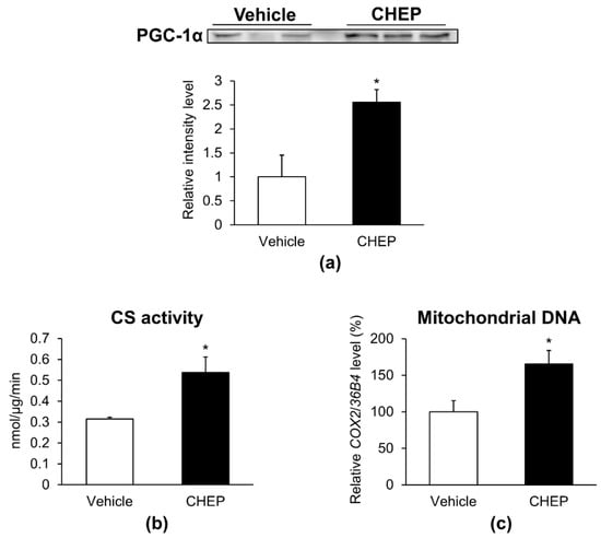 To determine whether CHEP could increase the amount of PGC-1α in C2C12 myotubes, C2C12 myotubes were incubated with vehicle (DMSO) or CHEP on day 5 of differentiation for 24 h. The amount of total PGC-1α protein, normalized to the total protein amount on the membrane as obtained after Ponceau S staining (Figure S1), was increased by 2.6-fold in cells treated with CHEP compared to those treated with vehicle control (Figure 1a). As an increase in PGC-1α stimulates mitochondrial biogenesis [], we measured CS activity and mitochondrial DNA content in these cells: both were 1.7-fold higher in cells treated with CHEP than in vehicle-treated cells (Figure 1b,c). These data suggested that CHEP enhanced PGC-1α protein expression and mitochondrial biogenesis in C2C12 myotubes.