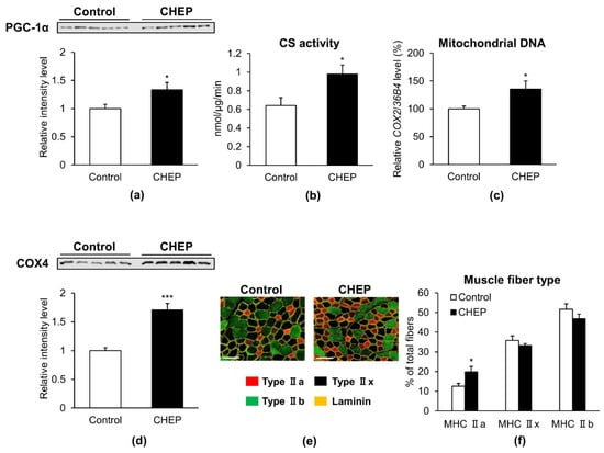 CHEP increases the amount of PGC-1α protein, mitochondria, and oxidative fibers in murine skeletal muscle. Seven-week-old male C57BL/6J mice were treated with an HC diet (control) or an HC diet containing 0.25% (w/w) CHEP for 5 weeks. Protein expression levels of PGC-1α (a) and COX4 (d) in the gastrocnemius were evaluated using western blotting. Total PGC-1α and COX4 protein levels were normalized to the total protein amount on the membrane, obtained after Ponceau S staining. Relative protein levels were expressed compared to those of the control. (b) CS activity in the gastrocnemius was normalized to protein content in the homogenate. (c) Mitochondrial DNA content in the gastrocnemius is expressed as a percentage relative that in control. Relative mitochondrial DNA copy number was calculated as the ratio of COX2 (mitochondrial) to 36B4 (nuclear) gene expression level, using real-time PCR. (e) Representative images of TA stained with anti-MHC type IIa (red), type IIb (green), and laminin (yellow) antibodies. Unlabeled fibers (black) are MHC IIx fibers. There are no MHC I (blue) fibers in this section. Scale bar: 100 μm. (f) Percentage of muscle fiber types in TA. Muscle fibers were counted in all cross sections based on immunofluorescence staining. Values are expressed as mean ± SEM (n = 5); * p < 0.05, *** p < 0.001 vs. control. HC, high carbohydrate; COX4, cytochrome c oxidase subunit IV; TA, tibialis anterior; MHC, myosin heavy chain.