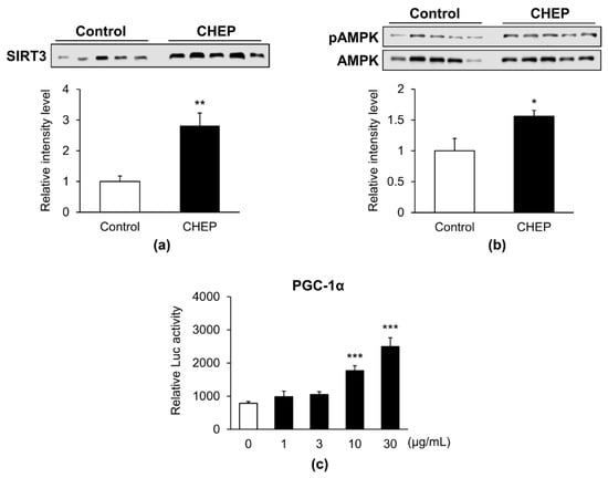 Reportedly, the expression of PGC-1α is increased by SIRT3 and phosphorylated AMPK [,]. Therefore, we measured the protein levels of SIRT3 and phospho-AMPK in skeletal muscles. Seven-week-old male C57BL/6J mice were fed an HC diet (control) or an HC diet containing 0.25% (w/w) CHEP for 5 weeks, as previously described. The expression levels of SIRT3 protein in CHEP-treated mice increased 2.8-fold compared to those in control mice (Figure 3a). The ratio of phospho-AMPK protein levels to total AMPK protein levels also increased 1.6-fold in CHEP-treated mice (Figure 3b). Furthermore, as AMPK-mediated phosphorylation of PGC-1α activates its transcriptional activity [], we performed a reporter gene assay to determine whether CHEP promoted the transcriptional activity of PGC-1α. As PGC-1α is a transcriptional coactivator that does not bind directly to DNA, we created a fusion construct of PGC-1α cDNA and Gal4 DNA-binding domain, transfected it into HEK293T cells, and examined whether CHEP enhanced the transcription activity of Gal4 DNA-binding domain-fused PGC-1α protein by (UAS)9-luciferase reporter gene assay []. Transfected HEK293T cells were incubated with the vehicle (DMSO) or CHEP for 24 h. Accordingly, CHEP dose-dependently increased the transcriptional activity of PGC-1α (Figure 3c). These observations suggested that CHEP promoted SIRT3 expression and AMPK phosphorylation, as well as that these changes were involved in the upregulation of PGC-1α and subsequent effects in murine skeletal muscle. Additionally, CHEP activated the transcriptional activity of PGC-1α, which might enhance SIRT3 expression.