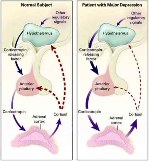 The dysfunction of HPA axis has been proposed as a common mechanism between obesity and cognitive and mood disorders. In obese individuals, the HPA axis is altered and higher cortisol concentrations are found in adipose tissue [121]. According to a recent meta-analysis, hair cortisol level is positively associated with anthropometric features such as BMI and waist-to-hip ratio [122]. It is known that cortisol is a stress hormone and there is evidence that HPA axis activation is an important factor for mood and cognitive disorders. More specifically, high cortisol concentration has been found in patients with major depression, psychotic and non-psychotic, compared to healthy controls [123]. Additionally, changes in the function of glucocorticoid receptors (GRs) type II (which bind glucocorticoids) that disrupt the HPA axis negative feedback are responsible for HPA axis dysregulation and high cortisol concentrations in depressed patients [124,125,126]. The dysfunction of HPA axis in patients with major depression is presented in Figure 1. In line with these, it has been noticed that many patients with major depression are not capable of reducing cortisol levels after dexamethasone administration, whereas after successful antidepressant therapy, there is a normal reaction to the dexamethasone suppression test [127,128]. At the same time, increased concentration of glucocorticoids can cause neurotoxicity and atrophy in the hippocampus, which plays a vital role in memory and mood regulation [129]. Moreover, elevated cortisol concentrations have been associated with cognitive impairment, no-dementia, and dementia [130]. Interestingly, recent studies show that chronic maternal stress during pregnancy is correlated with elevated cortisol levels in the fetus [131]. It has been proposed that maternal exposure to stress is associated with neuroendocrine and neuroanatomical alterations in the offspring, that can put the offspring into greater risk for behavioral, psychological, and cognitive problems [132].