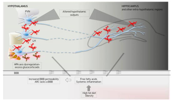 The blood-brain barrier prevents pathogens from crossing into the central nervous system [48]. The hypothalamic arcuate nucleus, as a circumventricular organ, lacks a typical blood-brain barrier, while it is responsible for the control of eating and energy expenditure. It is composed of two neuronal subpopulations, the orexigenic agouti-related peptide (AgRP)/neuropeptide Y (NPY) neurons and anorexigenic proopiomelanocortin (POMC)/cocaine and amphetamine regulated transcript (CART) neurons [49]. Chronic high-fat diet leads to the loss of POMC/CART neurons [12,37]. Thus, chronic high-fat diet may cause hypothalamic inflammation which alters neuronal control of appetite, caloric intake, and energy expenditure, causing a vicious circle of obesity.