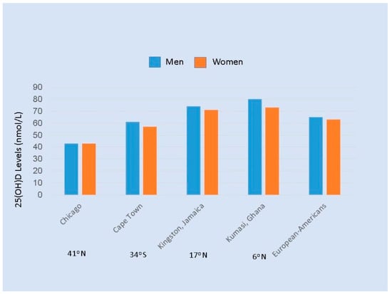 Average serum 25(OH)D levels (nmol/L) in men and women of African Ancestry ages 25 to 45 years living in four sites [32], and European Americans. The latitudes of the cities are given below the names of the cities. Note: Divide by 2.5 to convert nmol/L to ng/mL.