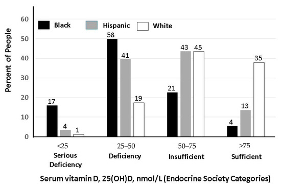 According to data from National Health and Nutrition Examination Survey (NHANES) 2001–2010, the prevalence of vitamin D deficiency (25(OH)D < 20 ng/mL) among those not taking vitamin D supplements was 75% for non-Hispanic blacks, 44% for Hispanics, and 20% for non-Hispanic whites (Figure 2), whereas severe deficiency (<10 ng/mL) was 17% in non-Hispanic blacks and only 1% in non-Hispanic whites [35]. Although definitions vary [36], there is consensus that levels below 10 ng/mL are a serious concern. A high prevalence of low 25(OH)D levels has also been documented in many other parts of the world [37,38,39,40,41].