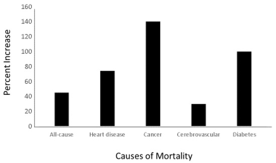 A comparison of death rates for African Americans with those of European Americans shows a large disparity for many diseases [150]. For example, the disparity in death rates from all causes for people aged 50 to 64 years is 45% higher in African American than in European Americans (Figure 3). Differences in multiple factors, such as hypertension, obesity, diet, income, education, and lower access to medical care, may contribute to some of those disparities, but they do not fully explain the differences [151,152,153,154,155].