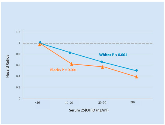 A US cohort of 3075 adults aged 70–79 years of age was followed for 8.5 years [159]. Although the prevalence of vitamin D deficiency was much higher in Blacks than in Whites, lower baseline serum levels of 25(OH)D were similarly associated with higher mortality in both Black and White participants (Figure 4). Because of the large Black/White difference in vitamin D status, 25(OH)D levels below 30 ng/mL statistically accounted for 38% of mortality in Blacks and 11% in Whites. In a multivariate model without 25(OH)D levels, Blacks had 22% higher mortality than Whites, but after inclusion of 25(OH)D in the model the excess mortality in Blacks was only 9% and not statistically significant.