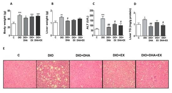 Effects of long-term DHA supplementation and/or aerobic exercise training on: (A) body weight, (B) liver weight, (C) serum ALT, (D) liver triglyceride (TG) content, and (E) liver morphology in 18-month-old diet-induced obese (DIO) mice. Data are mean ± SEM. n = 6–10 animals/group. * p < 0.05, ** p < 0.01, *** p < 0.001 vs. C group. # p < 0.05, ## p < 0.01 vs. DIO group.