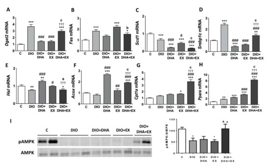 The catabolism of hepatic lipids was estimated by the expression of genes involved in lipolysis (Hsl) [] and fatty acid oxidation (Cpt1a and Acox) []. The decreased mRNA expression level of Hsl induced by the HFD was remarkably upregulated by DHA supplementation or regular aerobic physical exercise alone, but not by their combination (Figure 2E). In terms of fatty acids oxidation, the mRNA expression of Acox tended to be lower in untreated DIO mice and interestingly, the supplementation with DHA alone or in combination with exercise, caused a prominent upregulation of this gene involved in the peroxisomal β-oxidation of fatty acids (Figure 2F). Figure 2G shows that Cpt1a mRNA levels, involved in the mitochondrial β-oxidation process, were significantly upregulated in DIO mice performing regular aerobic physical exercise group and especially in the group that combined exercise with DHA supplementation, suggesting a synergistic effect of both interventions. We also analyzed the expression of Ppara, which encodes for a transcription factor that targets genes involved in hepatic fatty acid oxidation []. It was interesting to note that Ppara mRNA expression was upregulated in DIO mice, which is in agreement with previous observations []. This upregulation of Ppara by the HFD could be related to the increased need to oxidize fatty acids since higher levels of fatty acids arrive at the liver; however, this upregulation of fatty acids oxidation seems to be insufficient to catabolize the extra lipid loads in DIO mice. Interestingly, our data show that Ppara gene expression was significantly increased in the exercise trained groups and further upregulated in the group combining exercise with DHA supplementation (Figure 2H), which could contribute to the activation of hepatic liver catabolism and the improvement in liver steatosis observed in these groups. AMPK is a crucial nutrient and energy sensor that plays a key role in energy homeostasis maintenance. AMPK activation switches on catabolic pathways that generate ATP (such as fatty acid oxidation), while switching off biosynthetic pathways that consume ATP (i.e., TG synthesis) []. Furthermore, some studies have suggested that hepatic PPARα activity can be regulated also by AMPK, although conflicting results were found [,]. Here we evaluate the effects of exercise and/or DHA on AMPK phosphorylation, which leads to its activation []. Figure 2I shows that the phosphorylation of AMPK was significantly reduced in DIO mice, which is in agreement with previous studies in HFD-fed rodents []. Interestingly, only the combination of DHA and exercise was able to reverse the inhibitory effect of the HFD on AMPK activation, which could also account for the reduced liver steatosis since hepatic AMPK activation has been shown to lead to reduced steatosis and inflammation in obese mice [].