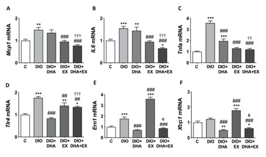 Mcp1, Il6, Tnfα and Tlr4 levels are key indicators of the proinflammatory state in liver []. All these genes were significantly upregulated in DIO mice compared with control group. The exercise intervention alone or in combination with DHA was able to reverse the induction of all these proinflammatory genes, while DHA only attenuated the expression of Tnfα and Tlr4 (Figure 3A–D).