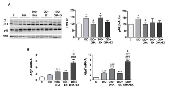 Long-term DHA supplementation and/or aerobic exercise training regulates the expression of key autophagy-related proteins/genes in the liver of 18-month-old DIO mice. (A) Representative Western blot (left panel) and densitometry analysis (right panels) of LC3 I and II and p62. Band densities of p62 were normalized to β-actin. (B) mRNA expression levels of hepatic Atg5 and Atg7. Data are expressed as mean ± SEM. n = 6–10. * p < 0.05, ** p < 0.01, *** p < 0.001 vs. C group. # p < 0.05, ### p < 0.001 vs. DIO group. ††† p < 0.001 for DIO + DHA vs. DIO + DHA + EX group. c p < 0.001 for DIO + EX vs. DIO + DHA + EX group.