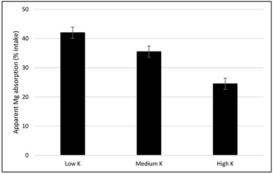 The effect of different dietary levels of K on apparent absorption of Mg (% intake) in sheep. Levels of K are expressed as g/kg dry matter (DM). Low K: 15.7 g/kg DM; medium K: 37.6 g/kg DM; high K: 77.4 g/kg DM. Standard error mean = 1.92. Data from [33].