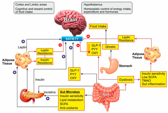 Various bacteria, viruses, fungi, and protozoa colonize the gastrointestinal tract, which is interactively involved in immune, metabolic, and neurological health [40,41]. The gut microbes play a major role in metabolism by fermenting the non-digestible dietary fibers to short-chain fatty acids (SCFA) such as butyrate, propionate, and acetate [42]. These SCFAs are involved in cholesterol metabolism and lipogenesis and are reported to play a central role in appetite regulation [43]. In the last two decades, several studies have shown that probiotic supplements can reduce body weight and improve glucose metabolism in rodents by changing the composition of gut microbiota [44]. Overweight and obese people show a dysbiosis characterized by lower microbial diversity associated with impaired glucose homeostasis and low-grade inflammation [45,46]. A meta-analysis of human clinical trials concluded that obesity was associated with higher counts of Firmicutes, Fusobacteria, Proteobacteria, and Lactobacillus reuteri, and lower counts of Bacteroidetes, Akkermansia muciniphila, Faecalibacterium prausnitzii, Lactobacillus plantarum, and Lactobacillus paracasei. An increase in the Firmicutes/Bacteroidetes ratio was observed in association with obesity [47], while a reduction in Firmicutes’ proportion with a rise in Bacteroidetes was associated with weight loss [48]. Further, the gut microbiome composition was found to be directly altered by the diet. In animal models, a high-fat diet favored Firmicutes and lowered the Bacteroidetes [49]. The metabolites derived from the fermentation of food by microbiome play a vital role in regulating host metabolism. The gut bacteria convert bile acid in the intestine to deoxycholic acid and lithocholic acid, which stimulate the secretion of incretin hormone GLP-1 and insulin, thereby promoting energy expenditure [50]. Dietary choline metabolism is also linked to microbiome composition. Conversion of choline into trimethylamine-N-oxide (TMAO) by microbiome has been associated with atherosclerosis and metabolic disorders [51]. The conversion of choline to the intermediate trimethylamine is mediated by several intestinal-resident bacteria. The SCFAs produced by gut bacteria are involved in insulin signaling associated with fat accumulation, modulate the secretion of GLP-1 and suppress the inflammatory immune response in the gut [45,52,53]. Inflammation and gut permeability are other markers associated with adiposity [54,55]. These two factors are interlinked as an increased permeability allows bacterial metabolites to leak into the circulation causing low-grade inflammation, a characteristic feature of obesity and insulin resistance [56]. The proinflammatory cytokines, in turn, can cause intestinal barrier disruption [57].