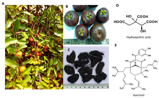 Garcinia indica. (A) Habitat of the Plant; (B) Ripe fruits; (C) Dried fruit rinds; (D) Hydroxy citric acid; (E) Garcinol.