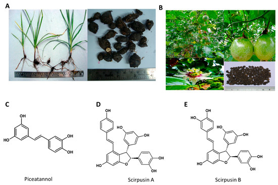 (A) Cyperus rotundus. Habit of the Plant, and Enlarged view of rhizomes. (B) Passiflora edulis; habit, enlarged fruit, flower and seeds, (C) Piceatannol, (D) Scirpusin A, (E) Scirpusin B.