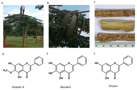 Oroxylum indicum. (A) Habitat of the plant; (B) Fruits; (C) Dried bark; (D–F) Oroxylin A, Baicalein and Chrysin.