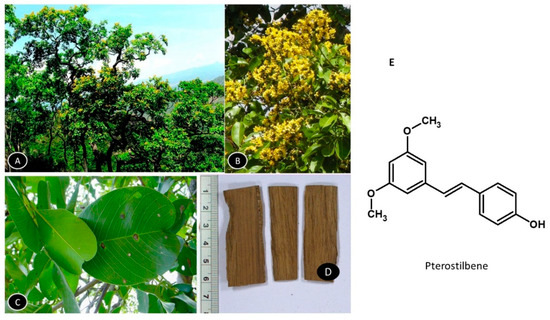 Pterocarpus marsupium. (A) Habitat of the plant; (B) A portion of shoot showing inflorescence and flowers; (C) Enlarged view of leaves; (D) Wood slices and major actives, (E) Pterostilbene.