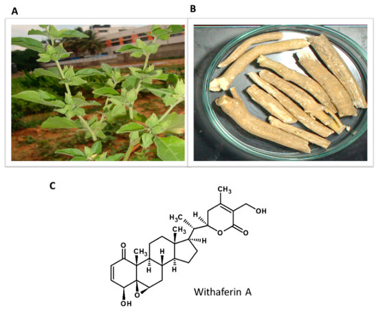 Withania somnifera or Ashwagandha (winter cherry) is a well-known medicinal plant in Ayurvedic medicine used for anxiety, depression and to relieve stress (Figure 8). Ashwagandha’s medicinal properties are mainly associated with bioactive ingredients such as withanolides and their glycoconjugates [141]. Withaferin A (WA) is a natural steroidal lactone present in various parts of the plant [142]. Figure 9 shows the habitat of the plant and the structure of the active constituent.
