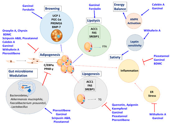 Several plant extracts with active phytochemicals have been explored for their anti-obesity activity and the list is exhaustive. Anthocyanins, the pigmented flavonoids, have anti-inflammatory, anti-diabetic and anti-obesity activities. In animals, anthocyanin supplementation reduced body weight gain, visceral fat and lipid levels, and alleviated leptin resistance [149]. Purified cyanidin-3-glucoside was found to induce thermogenesis by increasing mitochondrial UCP1 expression and activating AMPK phosphorylation [149]. Anthocyanins also have a positive interaction with gut microbiome and reduce obesity associated inflammation [150]. The fruits of Poncirus trifoliata L. contain several flavanones. Poncirin, one of the major flavanones, was found to have anti-obesity and anti-hyperglycemic effects in HFD included obese mice by modulating lipid and glucose metabolism [151].