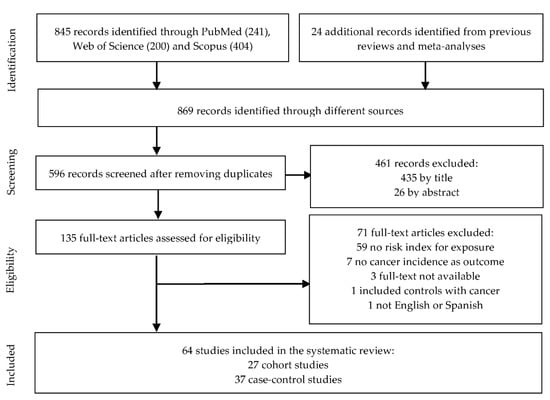 The study selection process according to PRISMA guidelines is reported in Figure 1. In total, 869 potential publications were identified from the databases (PubMed, Web of Science and SCOPUS) and other sources. After removing duplicates, 596 articles were selected, from which 435 were excluded based on titles and 26 on abstracts. Of 135 eligible articles, 71 were excluded due to the following reasons: 59 did not report risk index for sweet beverages and cancer incidence, 3 full-texts were not available, 7 considered other outcomes, 1 case-control study included controls with cancer at recruitment and 1 publication was not in English or Spanish. Finally, 64 studies were included in the systematic review, 27 cohort [23,24,28,31,34,35,36,37,38,39,40,41,42,43,44,45,46,47,48,49,50,51,52,53,54,55,56] and 37 case-control studies [57,58,59,60,61,62,63,64,65,66,67,68,69,70,71,72,73,74,75,76,77,78,79,80,81,82,83,84,85,86,87,88,89,90,91,92,93]. Of these, 27 studies were meta-analyzed.