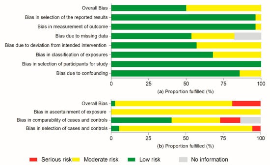 Risk of bias in the included studies. Legend: (a) risk of bias in cohort studies according to the Risk of Bias in Non-randomized Studies−of Exposures (ROBINS-E) tool and (b) risk of bias in case-control studies according to the Newcastle–Ottawa Scale (NOS).