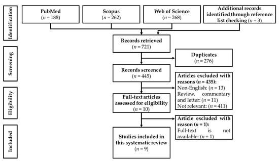 From the literature search, 721 articles were identified, of which 188 were obtained from PubMed, 262 from Scopus, 268 from the Web of Science, and 3 additional articles from reference list checking. A total of 445 unique records were identified and screened after removing 276 duplicates. Four hundred and thirty-five articles were excluded based on the selection criteria, of which 13 articles were not written in English, 11 articles were not original articles, and 411 articles were not relevant to this topic. A total of 10 articles fulfilled all criteria mentioned, but the full text of one of the articles (published in 1977) was not available after multiple requests to the authors and publisher [76]. Therefore, only nine articles were included in this review.