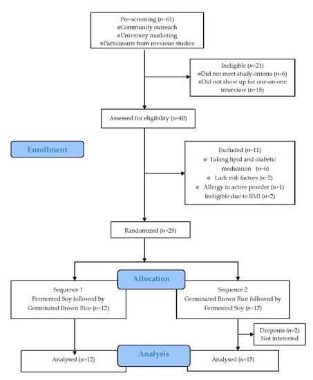 Prior to this, the study that investigated the effects of a commercial fermented soy product which does not contain active cultures on blood lipids in adults was a single arm before–after clinical trial in ten obese males and females [20]. In this crossover dietary intervention, we intended to examine the hypothesis that the daily consumption of 25 g of a related fermented soy powder would result in cardiometabolic benefits compared with an energy-matched comparison powder derived from germinated brown rice.
