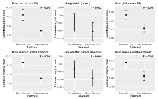 Estimated marginal means for the 24 h urine excretion of isoflavones (daidzein, genistein, glycitein) following the fermented soy and germinated rice intervention. Note: The y axis on a log10 scale.