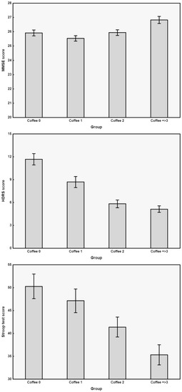 In order to disentangle the association of coffee intake from that of other parameters that were found to be significantly different in the subject groups, we built an analysis design by using the above-mentioned General Regression Models module, using age, sex, education, smoking and coffee consumption as independent predictors, and MMSE, HDRS, Stroop T, ADL, and IADL as dependent variables. Accordingly, we were able to assess that MMSE, HDRS, and Stroop T scores were significantly and independently different in the three coffee consumption subgroups, with a generally lower severity of HDRS with increasing coffee intake (F = 22.669, p < 0.000001), as well as with better MMSE (F = 4.105, p < 0.0071) and Stroop T (F = 4.806, p < 0.0028). The results of MMSE, HDRS, and Stroop T are graphically displayed in Figure 1 as bar graphs of continuous outcome variables obtained from the four groups of subjects (i.e., non-drinkers and drinkers of different cups of mocha coffee per day).
