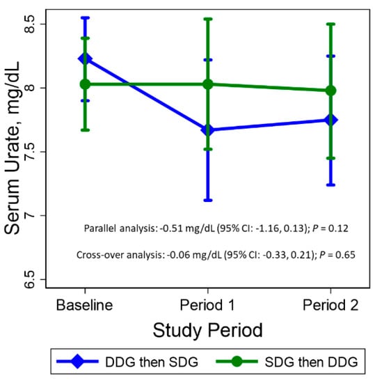 There was no within-person difference in SU between the DDG and SDG periods when the planned crossover analysis was performed (difference −0.06 mg/dL; 95% CI: −0.33, 0.21). In a period 1 only analysis, compared to SDG, DDG reduced SU by 0.51 mg/dL (95% CI: −1.16, 0.13).