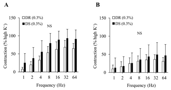 There was no difference in the contractile responses to the high K+ Krebs solution between the DR (0.3%) and DS (0.3%) groups (data not shown). There were no differences in the contractile responses to the EFS between the DR (0.3%) and DS (0.3%) groups (Figure 1).