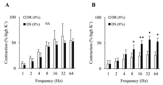 There was no difference in the contractile responses to the high K+ Krebs solution between the DR (8%) and DS (8%) groups (data not shown). Contractile responses to the EFS were more enhanced in the DS (8%) group than those in the DR (8%) group (p < 0.05 for 1, 32, and 64 Hz and p < 0.01 for 2, 4, 8, and 16 Hz; Figure 4).
