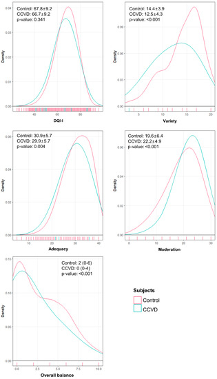 DQI-I component score densities. DQI-I, Diet Quality Index—International; CCVD, cerebrovascular and cardiovascular diseases. Total DQI-I, variety, adequacy, and moderation scores are presented as means and standard deviations. Overall balance scores are presented as medians with interquartile ranges. p-values were obtained by survey-weighted linear regressions.