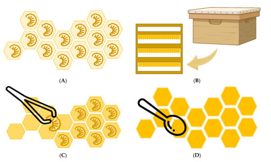 Royal jelly (RJ) production in royal cells inside a hive. (A) RJ production in queen cell base with worker bee larvae inside. (B) Hive for breeding honeybees and queen bees for RJ production. (C) Removal of worker larvae from royal cells. (D) Collection of RJ from the cells.