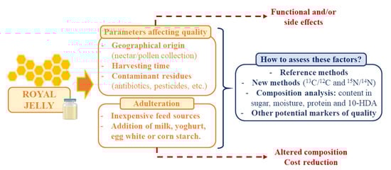 These days, RJ is considered as an attractive functional food but also an expensive product that can be submitted to adulteration as means to reduce production costs. In addition, other parameters can affect the final quality of RJ, such as the influence of geographical origin, harvesting time, or the presence of contaminant residues [7,103]. Furthermore, the use of reference methods to analyze the composition of RJ and the assessment of these factors is essential to guarantee the quality of the product and its expected physicochemical and organoleptic properties (Figure 2).