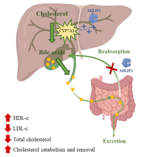 Cholesterol is converted into bile acids catalyzed by the enzyme cholesterol 7-α-hydroxylase (CYP7A1). Bile acids are then excreted or reabsorbed at the jejunum. MRJP1 upregulates the expression of CYP7A1 increasing bile acids synthesis and their excretion. In addition, MRJP1 can inhibit cholesterol and bile acid reabsorption.