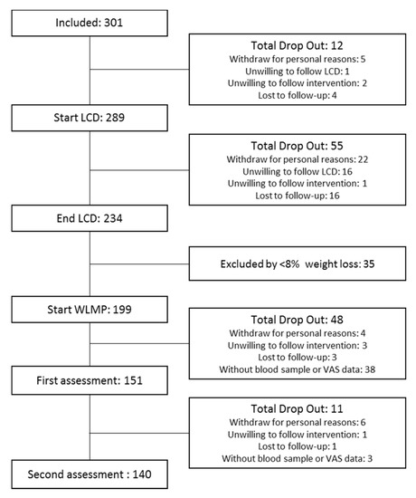 Briefly, after an initial 8-week low-calorie diet (LCD) period, participants achieving ≥8% of weight loss were included in the subsequent 12-week randomized double-blind parallel intervention phase for weight lost maintenance (WLM), with food products designed to reduce appetite or matching control products as placebo. Detailed information about study design, visits, and methods has been previously published [