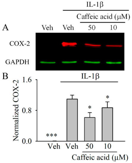 We next determined whether the effect of caffeic acid on PGE2 was associated with a downregulation of COX-2. In this assay, we only tested those concentrations of caffeic acid that showed significant effects (p < 0.05) on PGE2. As showed in Figure 3, 1 ng/mL IL-1β upregulated (p < 0.001) the expression of COX-2 in the myofibroblasts compared with the untreated cells. The cells co-treated with IL-1β and caffeic acid showed a significant downregulation of COX-2 compared with the IL-1b-treated cells at 50 and 10 µM (p < 0.05).