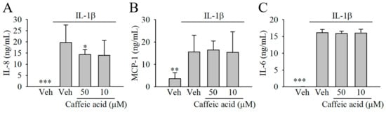 We next tested whether caffeic acid, at 50 and 10 µM, was able to modulate the biosynthesis of other molecules involved in the inflammatory response, including IL-8, MCP-1, and IL-6. Our results showed increased level of the cytokines investigated in the presence of 1 ng/mL IL-1β (Figure 4). Only a small reduction (~27%) of the concentration of IL-8 was observed in the presence of caffeic acid at 50 and 10 µM, although this effect was only significant at 50 µM. The concentration of MCP-1 and IL-6 remained unaffected in the cells co-treated with IL-1β and caffeic acid compared with the stimulated cells (Figure 4B,C).