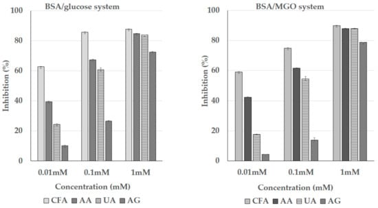 The concentration-dependent inhibitory effects of caffeic acid (CFA), ascorbic acid (AA), uric acid (UA), and aminoguanidine (AG) against advanced glycation end product (AGE) formation as measured in bovine serum albumin (BSA)/glucose and BSA/methylglyoxal (MGO) assays.
