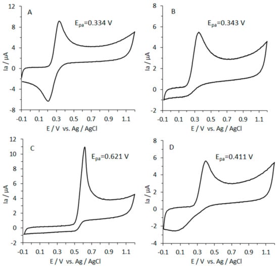 Cyclic voltammograms of 0.25 mM of standards solution (final concentration) of caffeic acid (A), L-ascorbic acid (B), uric acid (C), and Trolox (D) in 0.1 Britton–Robinson (B–R) buffer (pH 6.0) recorded from −100 to +1200 mV; scan rate 100 mV s−1.