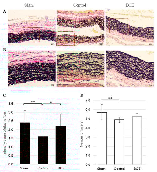 Representative images and semi-quantification of elastic fibers in Elastica van Gieson-stained tissues. (A) 100× magnification (scale bar = 50 µm) and (B) 200× magnification (scale bar = 20 µm) of the boxed area shown in (A). (C) Staining intensity of elastic fibers in the aortic tunica media semi-quantified at 3 intensities: 1, 2, and 3. (D) Evaluation of the number of elastic fiber layers in the aortic tunica media. Data are shown as means ± SEM; n = 10 (Sham), n = 20 (Control) and n = 14 (BCE). * p < 0.05, ** p < 0.01. Sham, sham surgery rats; Control, OVX rats without BCE treatment; BCE, OVX rats treated with 3% BCE; OVX, ovariectomized; BCE, blackcurrant (Ribes nigrum L.) extract; SEM, standard error of the mean.