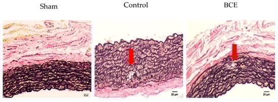 Representative images of elastin breaks in Elastica van Gieson stained tissues (200× magnification, scale bar = 20 µm). Arrows indicate elastin breaks. No elastin breaks were observed in Sham rats. Sham, sham surgery rats; Control, OVX rats without BCE treatment; BCE, OVX rats treated with 3% BCE; OVX, ovariectomized; BCE, blackcurrant (Ribes nigrum L.) extract.