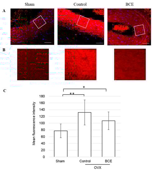 Next, we assessed α-SMA protein expression in the abdominal aorta of OVX rats by immunofluorescence staining (Figure 3A,B). α-SMA is the actin isoform that predominates within vascular smooth muscle cells (VSMCs) [33]. α-SMA protein expression was significantly higher in both OVX Control and OVX BCE rats than in Sham rats (p < 0.01 and p < 0.05, respectively), corresponding with other studies in which estrogen inhibited VSMC proliferation [34,35,36]. Furthermore, α-SMA protein expression was decreased in OVX BCE rats compared with that in OVX Control rats (Figure 3C). These results were consistent with those of elastin fragmentation (Figure 2), but showed the opposite trend to elastic fiber staining intensity (Figure 1C) and number of elastic fiber layers (Figure 1D). At first, we speculated that BCE reduced α-SMA expression through phytoestrogenic activity, but α-SMA expression was significantly higher in OVX BCE rats than in Sham rats (p < 0.05). Thus, our results suggested that BCE might exert preventive effects on VSMC proliferation not only via phytoestrogenic activity, but also other pathways. Intact elastin has been reportedly associated with a contractile phenotype of VSMCs [37]. Other studies have also reported that elastin is a potent autocrine regulator of VSMC activity and stabilizes vascular structure by inducing a quiescent contractile state in VSMCs [19,38]. Our results indicated that α-SMA expression was decreased in OVX BCE rats compared with that in OVX Control rats, which correlated with increased elastic fiber numbers and decreased elastin degradation. The reduced α-SMA protein expression might have been caused by elastin fragmentation or reduction in elastic fiber abundance, rather than the phytoestrogenic activity of BCE.
