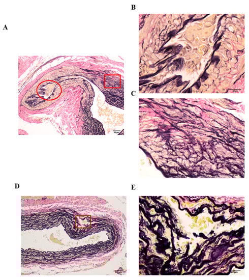 Representative images of pathological vascular remodeling in Elastica van Gieson-stained tissues of OVX Control rats. (A,D) Low magnification (100×, scale bar = 50 µm); (B,C,E) high magnification (400×, scale bar = 20 µm), magnification of the boxed areas in (A,D). (B) high magnification of the red circle area; (C) high magnification of the red boxed area in (A); (E) high magnification of the red boxed area in (D). OVX, ovariectomized.