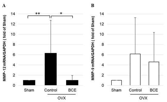 Mmp mRNA levels in OVX BCE rats. (A) Mmp-12 and (B) Mmp-9 mRNA levels quantified by RT-qPCR. Data are shown as the mean ± SEM of at least three independent experiments (n = 9). * p < 0.05, ** p < 0.01, vs. Sham rats. Sham, sham surgery rats; Control, OVX rats without BCE treatment; BCE, OVX rats treated with 3% BCE; OVX, ovariectomized; BCE, blackcurrant (Ribes nigrum L.) extract; MMP, matrix metalloproteinase; RT-qPCR, quantitative reverse-transcription polymerase chain reaction; SEM, standard error of the mean.