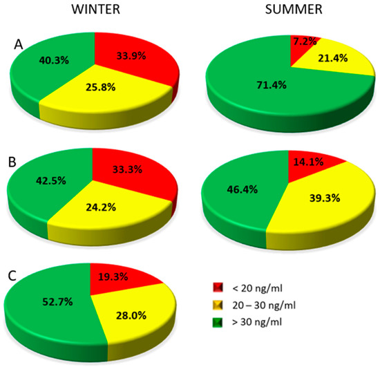 In the control group (sampling in winter), the serum concentration of 25(OH)D in 19.4% of patients was below 20 ng/mL, in 28.0% it was within the range of 20–30 ng/mL, while 52.7% were above 30 ng/mL (Figure 2C).
