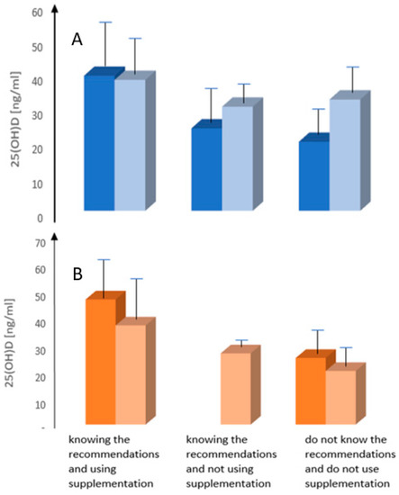 Mean serum 25(OH)D concentration (±SD—error bars) in the groups of women treated for breast cancer depending on the knowledge of vitamin D supplementation guidelines and supplementation of vitamin D. (A)—Group A—women treated for breast cancer tested the first time in winter. (B)—Group B—women treated for breast cancer tested the first time in summer. Dark (left) bars in the pair—values and data before inclusion into the study; pale bars (right) in the pair values and data during second testing half year later.
